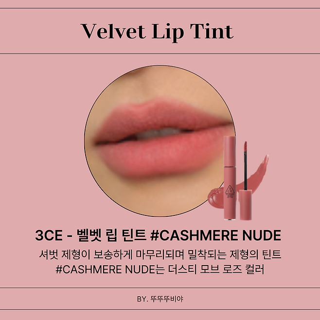 입술에 닿는 순간 사르르 녹아드는 듯한 셔벗 제형이 보송하게 마무리되며 입술에 자연스레 물들며 밀착되는 VELVET LIP TINT. 보드라운 벨벳 피니스 텍스처가 꽃물이 스며든 듯한 컬러를 더욱 풍부하고 차분하게 표현하는 틴트. 캐시미어 누드 컬러는 캐시미어의 촉감을 닮은 더스티 모브 로즈 컬러야~