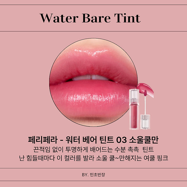 끈적임 없이 투명하게 배어드는 생기 애착 수분 촉촉 틴트인 페리페라 워터 베어 틴트.입술 위에 가볍게 배어들어 오랜시간 맑은 생기& 잔잔하게 일렁이는 수분 텍스처& 스밈 광택으로 내추럴 윤기립 완성 가능. 03 소울쿨만 컬러는 난 힘들때마다 이 컬러를 발라 소울 쿨~만해지는 여쿨 핑크라고 해!