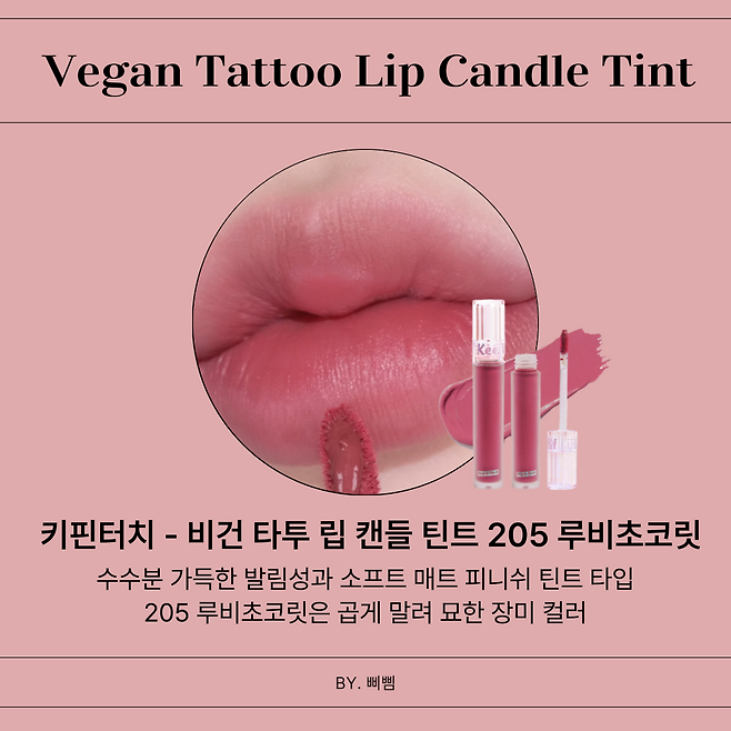 수분 가득한 발림성과 소프트 매트 피니쉬로 우수한 지속력의 비건 촛농 제형인 비건 타투 립 캔들 틴트. 부드럽고 실키한 사용감과 보송한 텍스쳐&미세화한 입자로 굴곡을 집중커버하는 틴트. 205호 컬러인 루비초코릿은 곱게 말려 묘한 장미 컬러로! 여름뮤트에게 딱 어울리는 립이야