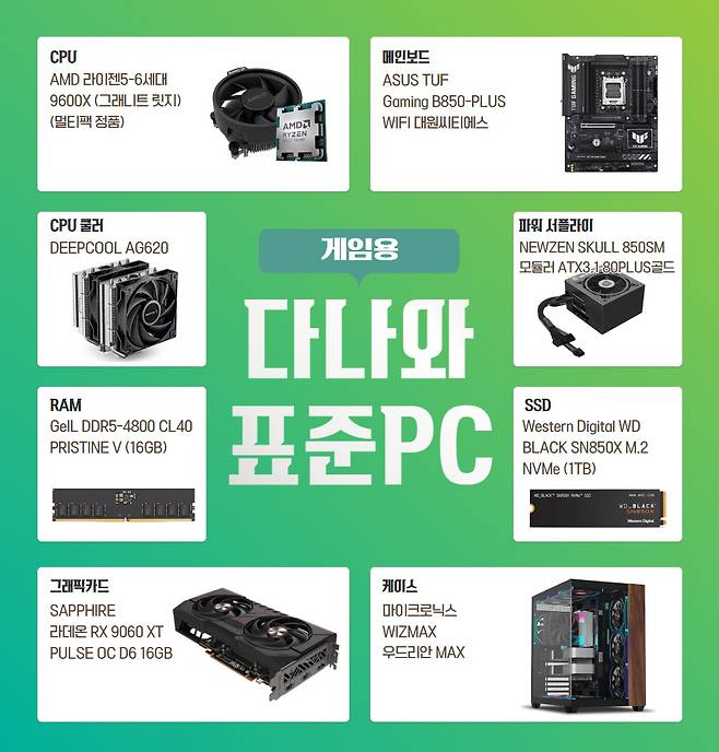 여기에 뛰어난 가성비를 자랑하는 AMD B850 메인보드와 CPU의 열을 효과적으로 제어하는 쿨러, 높은 용량에 안정성까지 갖춘 파워서플라이, 감각적인 디자인에 높은 확장성과 쿨링 효율을 겸비한 케이스를 사용해 고사양의 게임을 합리적인 가격으로 즐길 수 있을 것으로 보인다.
