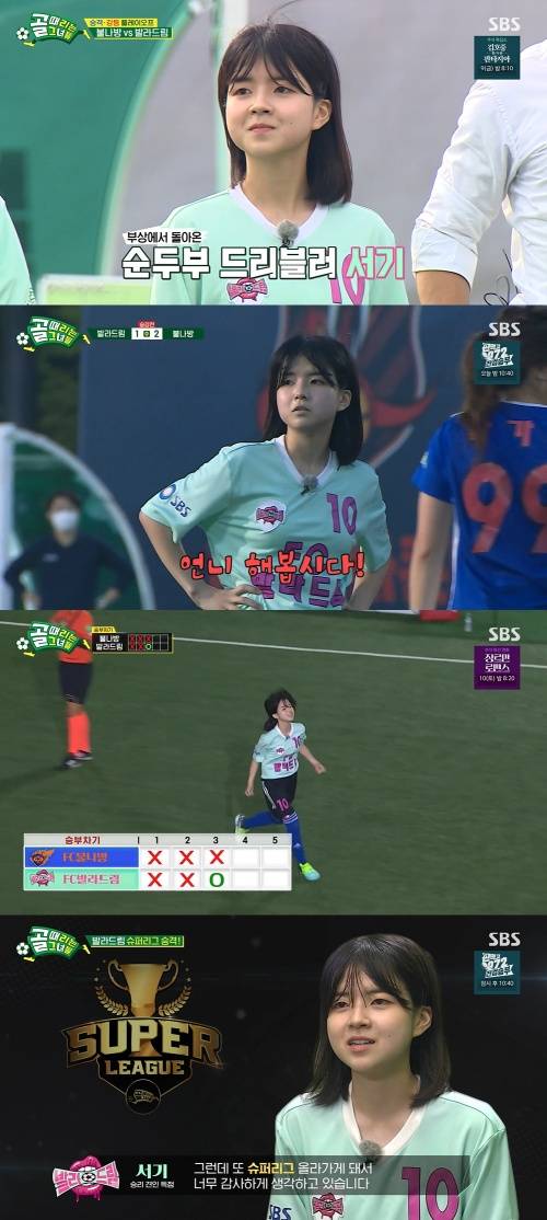 서기의 존재감은 승부차기에서 가장 빛났다. 세 번째 선수로 나선 서기가 선취점을 올린 것. 이는 'FC발라드림'의 극적인 승리까지 이어졌다. 경기를 마친 서기는 "드라마도 이렇게 하긴 힘들다. 슈퍼리그 올라가게 돼서 감사하다"라고 뜨거운 소감을 전했다. 앞으로 서기가 어떤 플레이와 기량을 보여줄지 귀추가 주목된다.