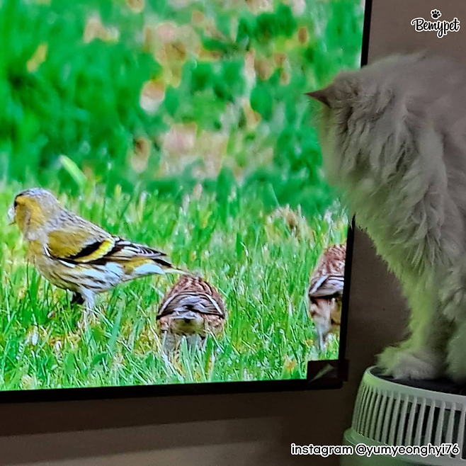 또한, TV에선 고양이 호기심을 자극할 만한 소리가 나는데요. 새의 날갯짓이나 울음소리 등이 잠자던 고양이도 귀를 쫑긋 세워 TV 화면을 쳐다보게 합니다.