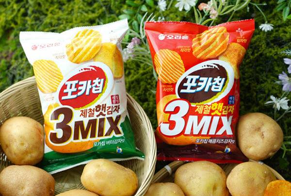 오리온은 햇감자 제철에만 맛볼 수 있는 ‘포카칩 햇감자 3믹스 버터감자맛’과 ‘포카칩 햇감자 3믹스 매콤치즈감자맛’의 2종의 신제품을 출시했다. 국내 생감자칩 최초로 3가지 모양의 감자칩을 한 데 담은 것이 특징이다. 가벼우면서 바삭한 식감의 일자컷, 굴곡 사이 진한 양념 맛을 느낄 수 있는 사선컷, 그리고 묵직하면서 풍성한 식감을 자랑하는 직각컷 등 햇감자를 3가지 모양으로 썰고 튀겨 재미를 더했다. 편의점 기준 판매가는 2,200원이다.