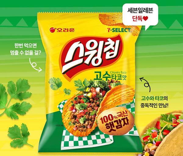 오리온은 1994년부터 특별한 형태로 만든 감자칩 제품을 판매하고 있다. 감자칩의 표면에 물결 모양을 넣어 더욱 바삭하며 양념도 많이 묻게 되는 ‘스윙칩’이 바로 그것이다. 편의점 세븐일레븐은 스윙칩의 특별한 맛을 담은 신제품을 자사 단독으로 출시했다. ‘스윙칩 고수타코맛’으로, 고수를 그리 즐기지 않는 이들도 맛있게 먹을 수 있는 제품이다. 스윙칩 고수타코맛의 판매가는 1,700원이다.