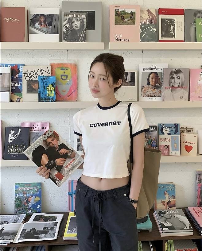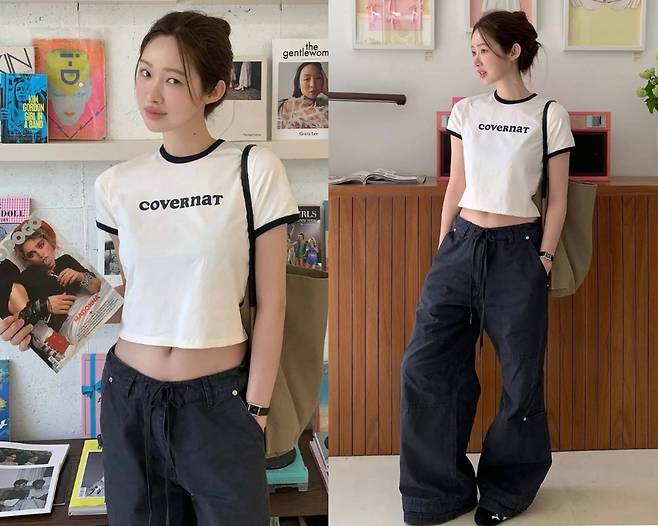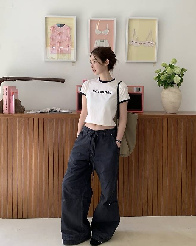 차정원은 화이트와 블랙 배색의 크롭 티셔츠에 블랙 와이드 팬츠를 매치해 Y2K 스트리트 감성을 완벽하게 표현했습니다.
