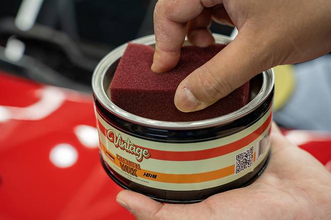 오늘 사용할 제품은 ‘오토그루밍 빈티지 왁스’로, 고체왁스에 입문자가 사용하기 쉬운 제품이다. 카나우바 성분이 15% 들어갔고, 특히 발수 내구력이 뛰어나 겨울철 폭설을 앞두고 작업하기 좋은 제품이다.