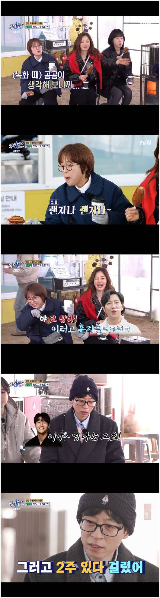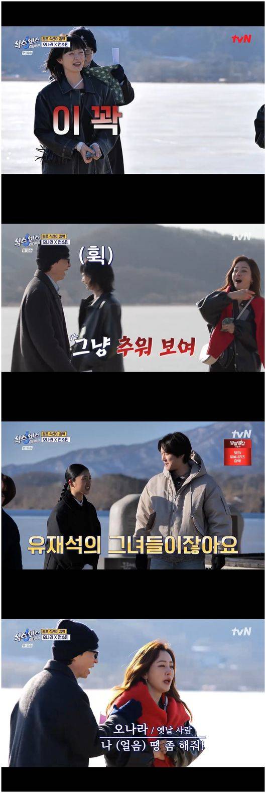 미미는 “유재석의 그녀들 아니냐”라며 그들을 맞이했다. 전소민은 “입이 다 얼었다”라며 엄살을 부렸고, 유재석은 “너 안 춥냐고”라며 전소민이 얇게 입은 것에 대해 한탄했다. 전소민은 “오랜만에 외출이라 예쁘게 입었다”라며, 오나라는 “나 맨다리다. 식스센스 오랜만에 온다고 한껏 꾸미고 왔다”라며 뽐냈으나 유재석은 한참을 웃더니 “그냥 추워보이는데”라고 말해 찐친, 찐형제 같은 느낌을 뽐냈다.
