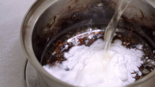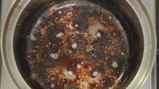 이때 베이킹소다를 탄 냄비에 충분히 넣고, 식초를 조금 부으세요.