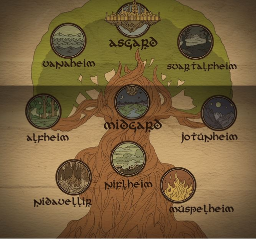 이 모든 창조는 위대한 물푸레나무 위그드라실의 존재와 함께 합니다. 위그드라실은 북유럽 신화 속 세계를 연결하는 세계수입니다. 뿌리가 3개로 아스가르드, 요툰헤임, 니플헤임에 뻗어 있다는 설과 9개로 모든 세계에 뻗어 있다는 설까지 의견이 분분합니다.