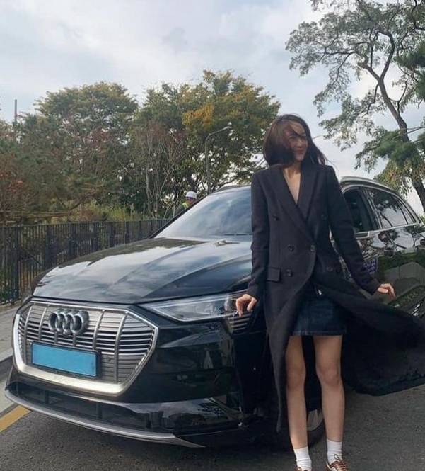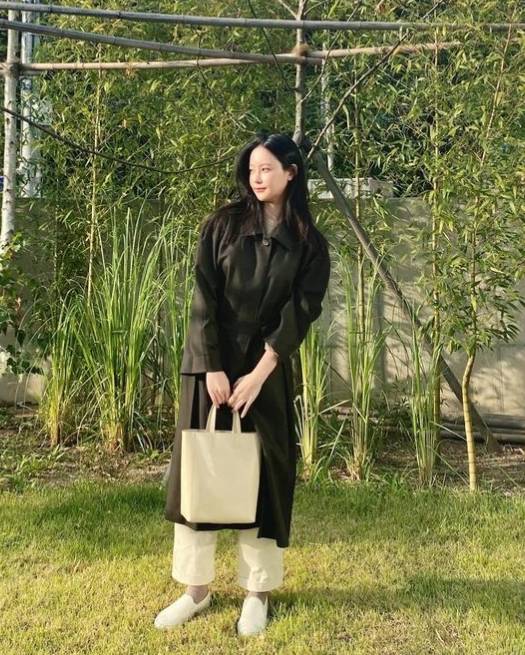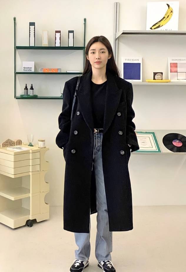 배우 차정원은 더블 버튼 롱코트에 그레이쉬한 느낌의 연청 데님을 입었다. 골드 버클이 있는 벨트와 블랙과 화이트가 섞인 운동화를 매치해 세련돼 보인다.
