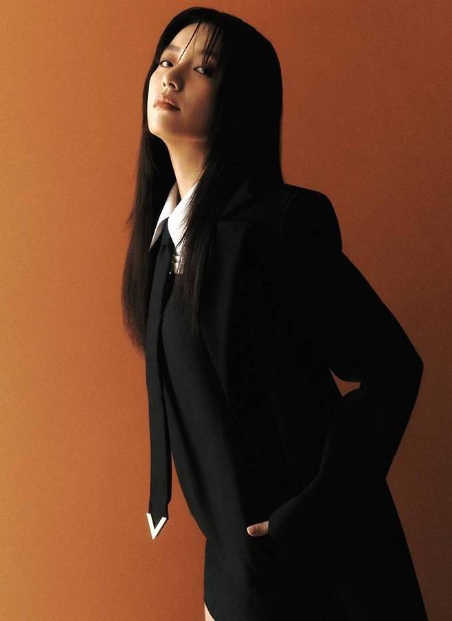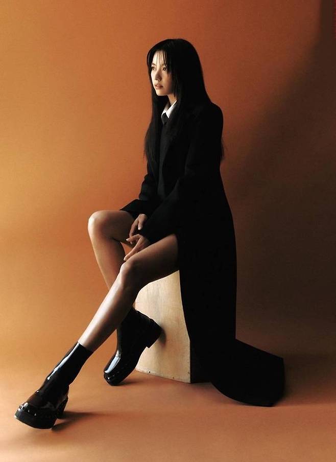 턱시도 느낌의 더블 브레스트 코트를 활용한 배우 정수정의 감각적인 믹스매치룩. 자칫 무거워질 수 있는 코트 디자인이지만 데님 스커트에 로퍼를 매치해 경쾌한 무드가 느껴진다.