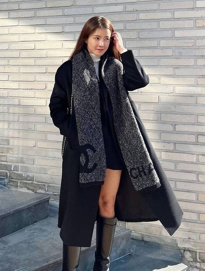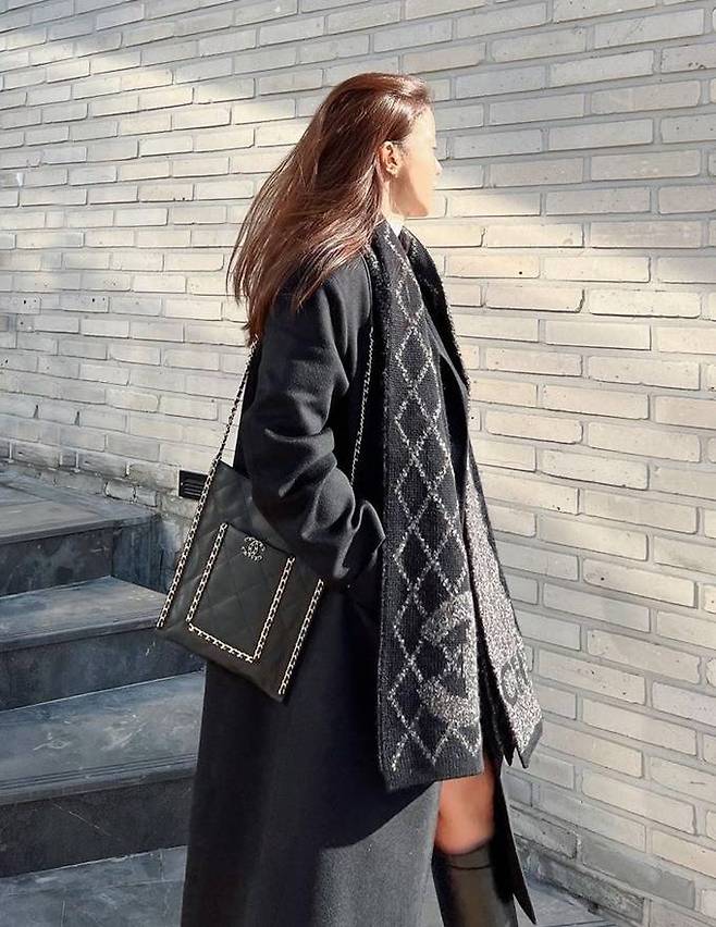 배우 이시영은 무릎을 덮는 긴 길이의 블랙 롱코트 안에 흰색 목폴라 니트와 숏 팬츠를 매치했다. 샤넬의 체인백과 머플러로 포인트를 줘 고급스러운 분위기를 자아낸다.