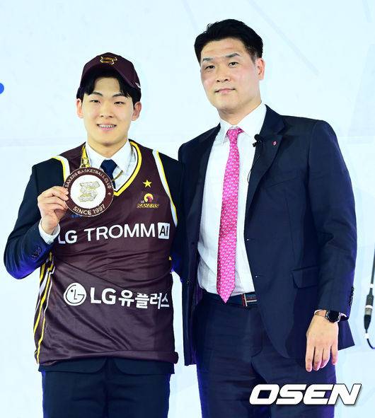 한양대 김선우가 1라운드 10순위로 LG에 지명되며 조상현 감독과 기념촬영을 하고 있다. 2025.11.14 /jpnews@osen.co.kr