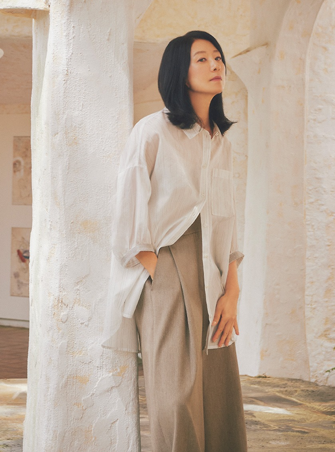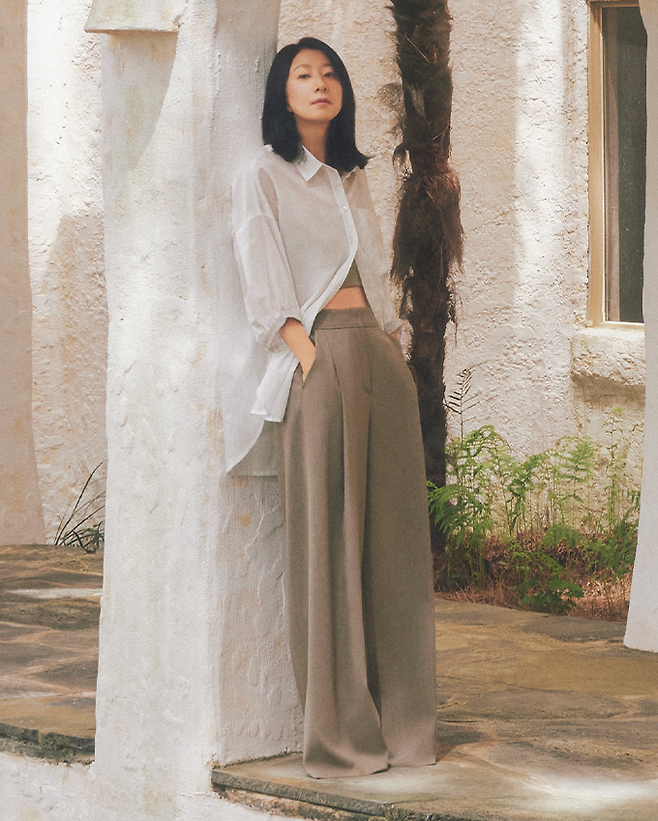 김희애는 클래식한 버튼다운 셔츠와 포멀한 팬즈를 매치해 클래식한 멋이 깃든 우아한 섬머룩으로 연출했다.