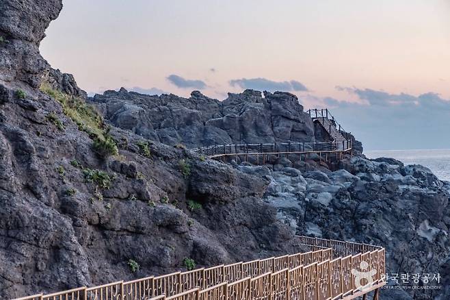 이 산책로의 가장 큰 특징은 지질학적 으로 매우 독특한 풍경입니다. 해안 절벽은 조면암과 집괴암으로 이루어져 있으며, 거센 해풍과 파도의 영향으로 오랜 시간 침식된 흔적이 고스란히 남아 있습니다.