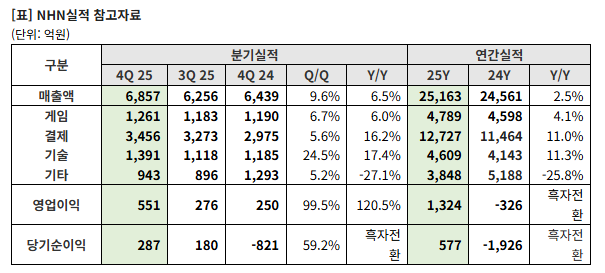 NHN은 12일 실적발표 콘퍼런스콜을 통해 2025년 매출 2조5163억원, 영업이익 1324억원(이하 연결기준)을 기록했다고 설명했다.