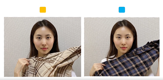 여러 옷들 중에서 어떤 것들로 비교해야하는지 궁금해하실수도 있는데요. 옷을 정할 때 기준은 없습니다. 패턴이 있어도 괜찮고, 꼭 상의끼리 하의끼리 비교하지 않아도 괜찮습니다. 긴팔이든, 반팔이든 중요하지 않아요. 이때 생각하셔야 할 건 오직, 컬러입니다!