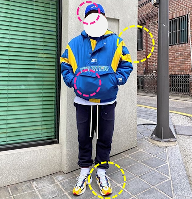 왼쪽은 신발과 상의에 노란색이 있고, 모자와 상의 둘 다 파란색이 있어요. 오른쪽은 가방과 신발이 브라운이고, 옷소매와 양말이 검정이죠. 이렇게 컬러들을 한 쌍 이상 겹치게 입어주면 전체적으로 통일감이 있어 보이면서 스타일리쉬한 패션을 완성시킬 수 있습니다.