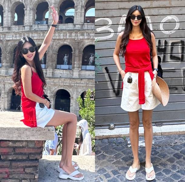 이번 룩의 포인트는 단연 ‘컬러 대비’. 뜨거운 태양 아래 박솔미는 선명한 레드와 화이트의 조합으로 이국적인 풍경 속에서도 또렷하게 빛나는 존재감을 뽐냈습니다.