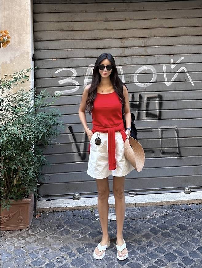 박솔미는 강렬한 레드 민소매 상의에 화이트 쇼츠를 매치해 여름의 생동감을 담은 데일리룩을 완성했습니다.