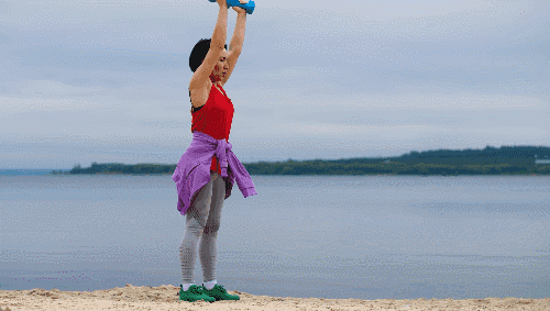 손에 아령이나 생수병을 들고 바닥에 똑바로 서서 준비합니다. 다리는 넓게 벌립니다. 무릎을 구부리면서 엉덩이를 뒤로 빼고 스쿼트 자세를 만듭니다. 일어서면서 팔을 머리 위로 뻗습니다.