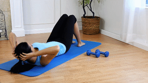 매트에 등을 대고 누워 준비합니다. 손을 머리 옆으로 옮겨 가볍게 댑니다. 무릎을 세우고 발은 바닥에 고정합니다. 복부에 힘을 주면서 상체를 들어 올립니다. 최대 지점에서 잠시 멈춘 후, 다시 원래 자세로 돌아옵니다.