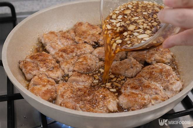 양면이 노릇하게 익으면 팬에 고인 여분의 기름을 닦아낸다. 기름을 제거해야 나중에 넣을 양념장이 고기에 겉돌지 않고 잘 배어든다.