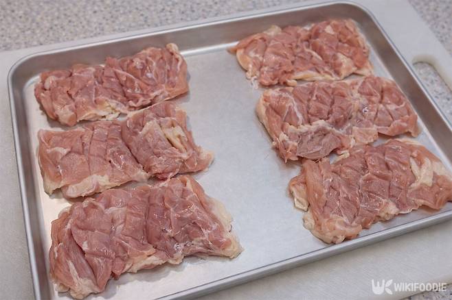 1. 닭 다리 살은 찬물에 씻어 물기를 닦고 두꺼운 부위에 칼집을 낸다.