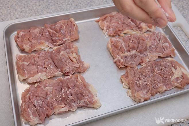 밑간은 소금과 후추면 충분하다. 소금은 고기 단백질을 응고시켜 육즙을 가두는 역할을 하므로 아주 조금만 뿌린다. 후추는 닭의 냄새를 잡아주니 넉넉히 뿌려 10분 정도 재워둔다.