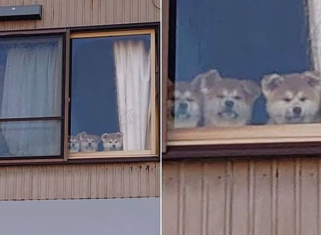 산책을 하려고 엄마 강아지와 함께 밖을 나선 집사는 섬뜩한 시선이 느껴저서 고개를 돌려봤다가 창문 앞에 앉아서 쳐다보는 아기 강아지들을 보게 된 것이라고 합니다.