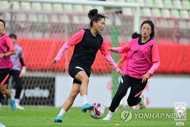 (서울=연합뉴스) 동아시아축구연맹(EAFF) E-1 챔피언십(동아시안컵)에 참가한 한국 여자 축구대표팀 장슬기가 18일 일본 이바라키현 가시마 경기장에서 훈련을 하고 있다. 2022.7.18 [대한축구협회 제공. 재판매 및 DB 금지]