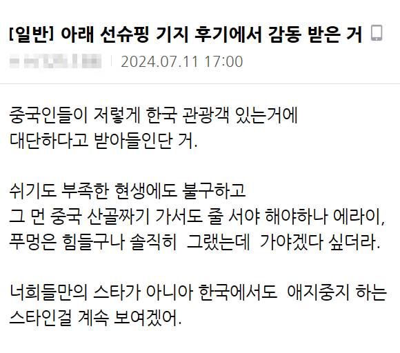 지난 11일 한 팬은 온라인 커뮤니티에 글을 올려 "살면서 쉬는 시간도 부족하고 그 먼 중국 산골짜기 가서 줄을 서는 건 힘들겠다고 생각했는데, 중국인들이 한국 관광객을 보고 대단하다고 받아들인다는 소식을 듣고 가야겠다 싶었다"면서 "중국 사람들만의 스타가 아니라 한국에서도 애지중지하는 스타인 걸 계속 보여야겠다"고 전했습니다.