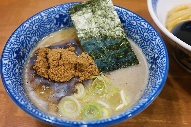 이곳의 츠케지루는 돼지, 닭, 어패류 등을 넣고 푹 끓인 육수를 베이스로 한다. 여기에 차슈와 죽순 등을 더하고, 감칠맛의 정점을 찍을 어분을 가득 넣어 완성했다. '농후' 츠케멘이라는 이름답게 국물 맛이 매우 진하다.