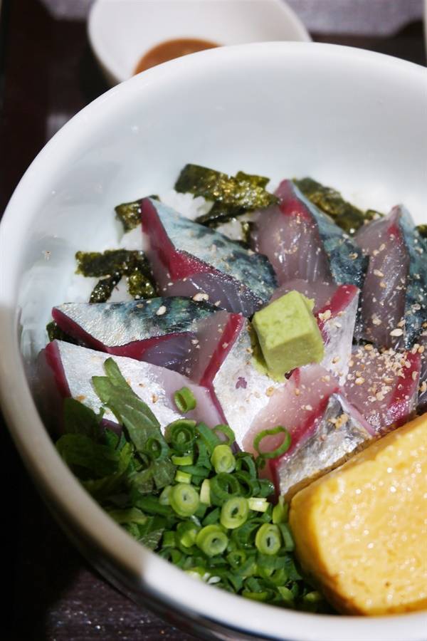 이것이 바로 참깨 고등어 회 덮밥. '쇼쿠도 미츠'의 해산물 덮밥과는 완전히 다른 색감이다. 회 위로 윤기가 자르르 흐른다. 붉은 색과 푸른 색이 섞인 고등어 회를 보며 연신 셔터를 눌렀다. 고등어 회와 함께 그릇에 올라가 있는 것은 약간의 파와 달걀말이.