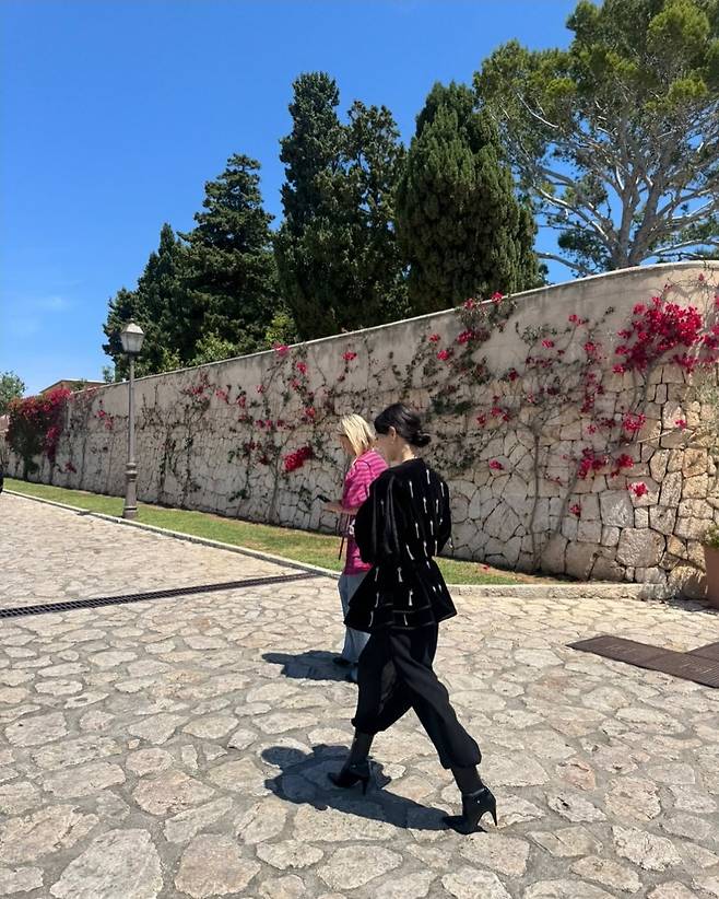 진주 귀걸이와 미니멀한 업스타일 헤어는 군더더기 없이 절제된 고급미를 보여줬고, 주얼리 박람회장을 거닐며 선보인 이 룩은 공간의 격조까지 끌어올리는 분위기를 자아냈습니다.