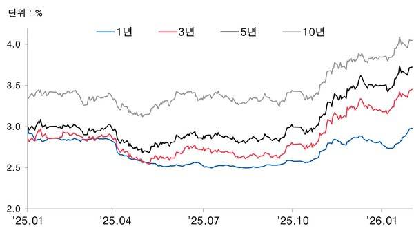 3일 금융권에 따르면 국민은행은 경영 전략의 최우선 과제로 '저원가성 핵심예금 확보'를 지목했다. 은행채(무보증, AAA) 10년물 금리가 4%대를 돌파하고 5년물 역시 저점 대비 90bp(1bp=0.01%p)가량 증가하면서 시장성 조달인 채권 발행 비용이 빠르게 높아지고 있기 때문이다. 은행채(무보증 AAA) 10년물 금리도 1월29일 4.004%를 기록하며 4%대로 진입한 데 이어 이달 2일에는 4.047%까지 상승했다.