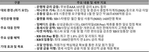 국민은행 관계자는 "은행채 금리 상승과 가계대출 위험가중치 상향, 기업대출 금리 인하 등 대내외 불확실성 속에서 수익성을 방어하려면 안정적인 예금 조달이 필수"라며 "플랫폼 경쟁력을 바탕으로 임베디드 금융을 확대하고, 금융 사각지대에 있는 영세 사업자를 위한 상품을 개선해 핵심예금 기반을 더욱 탄탄히 다질 것"이라고 말했다.