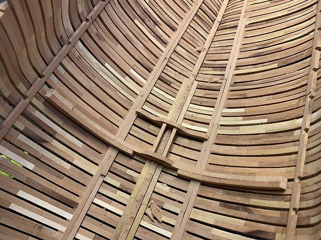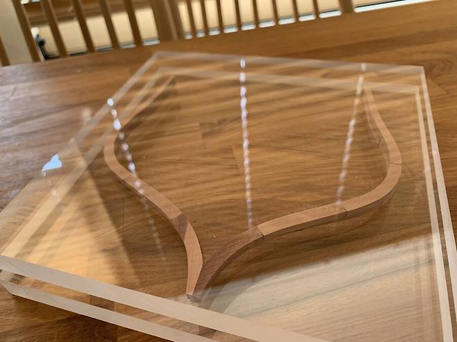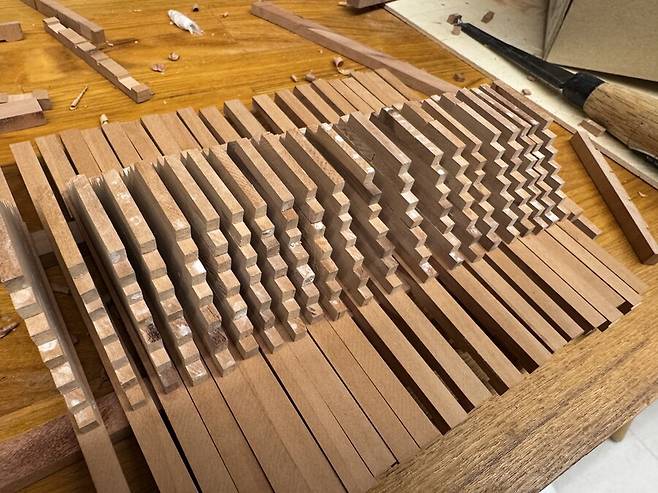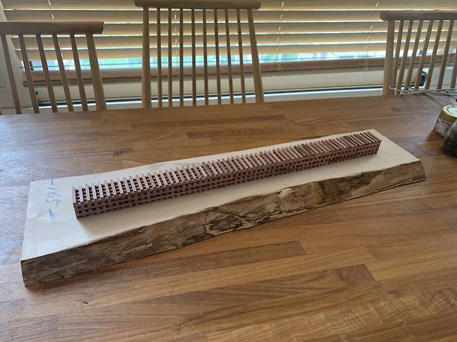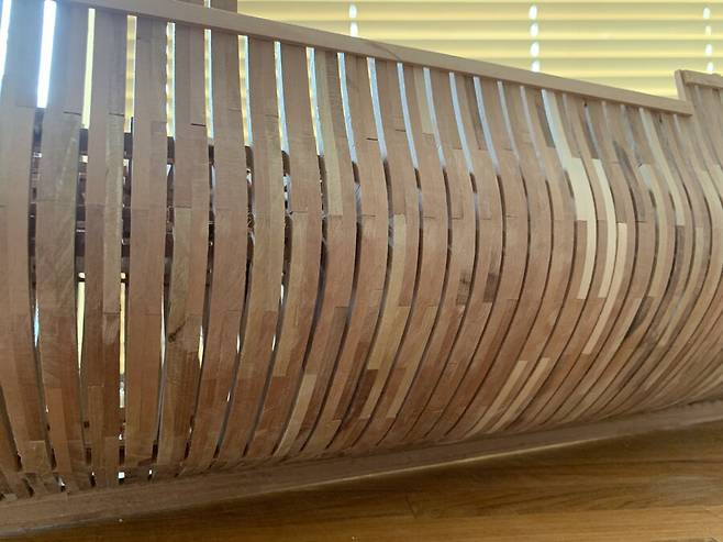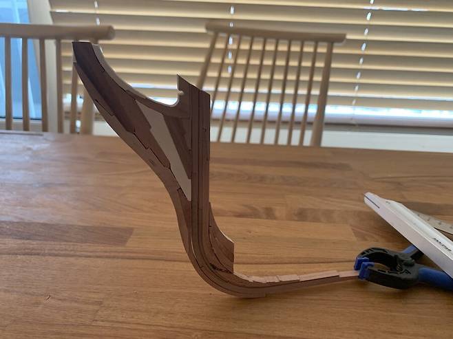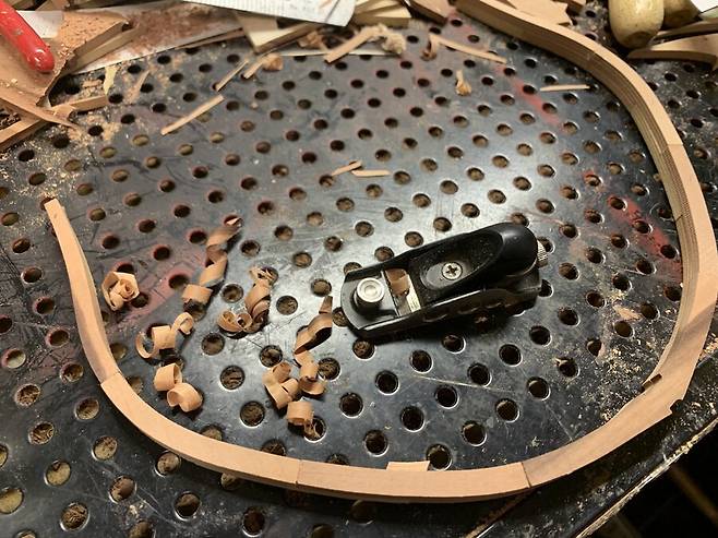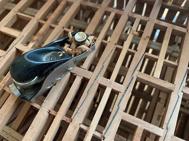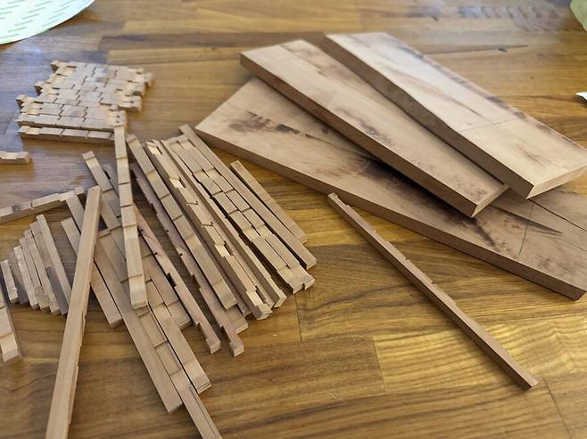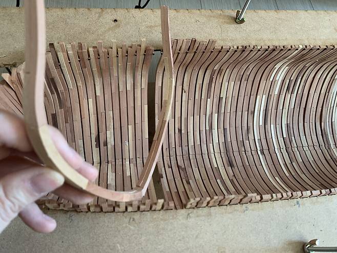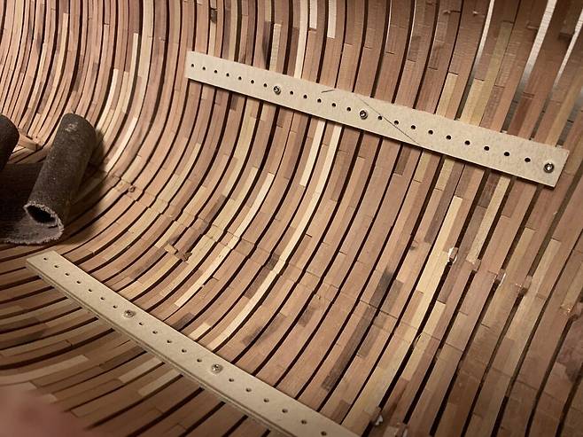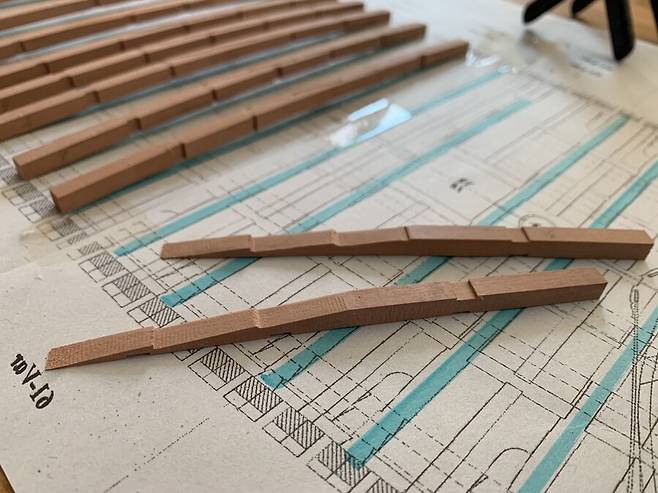 도면대로 만들어진 늑골은 완전건조가 될때까지 무거운 아크릴 판에 올려져 몇일동안의 건조과정을 거치게 됩니다. 속살이 드러난 배나무는 습기에 에 취약하기 때문에 필요한 과정 입니다. 하지만 그래도 이후 건조 과정중에 휘고 뒤틀린 목재를 바로잡느라 꽤 많은 공과 시간을 들이게 됩니다.