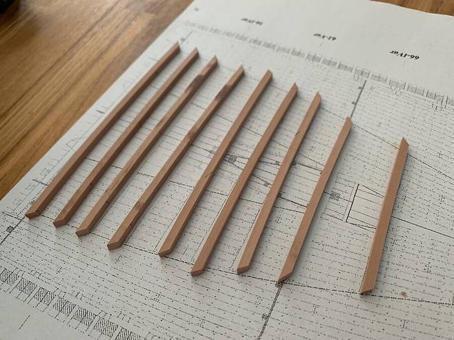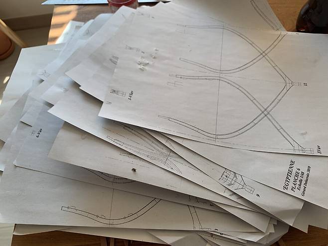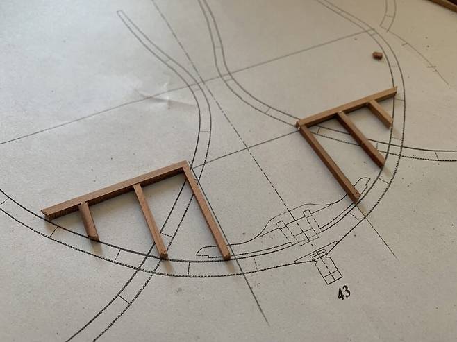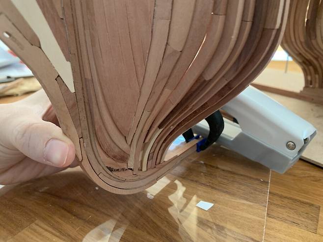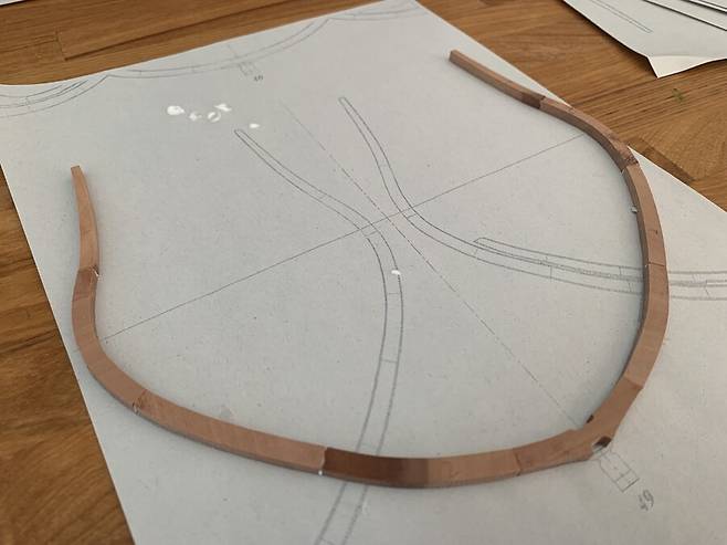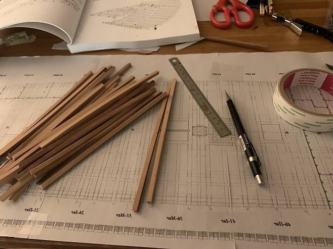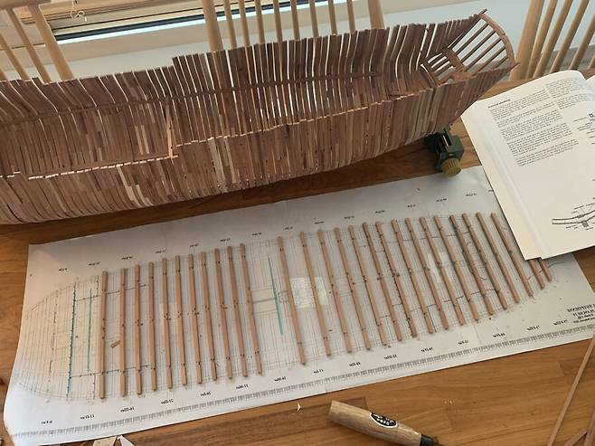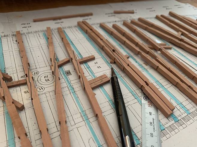 이후 자동대패로 두께를 4mm 에 맞춘 판재로 cnc 작업을 거치고 갱지를 대고 늑골을 한조씩 만들게 됩니다. 한조의 늑골은 2개의 짝으로 이루어져 있는데 갱지에 1/64로 스케일 조절된 도면을 출력해서 맞추고 조립하는 모습 입니다. 딱 맞아 떨어지는걸 보면서 느껴지는 쾌감은 이루 말할 수 없습니다.