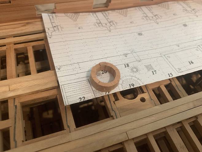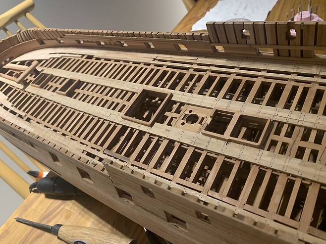 사실 올룹 데크 (최 하단 갑판) 는 위에서 그렇게 잘 보이진 않을것 같아 흉내만 내고 넘어갔는데 건데크(메인 중간 갑판) 작업후에 많이 후회 했습니다. 목범선의 꽃은 화려한 외형 이라고 생각했는데, 그게 아니었습니다. 범선의 꽃은 데크빔 입니다. 내부의 데크빔 에서 오는 구조적인 조형 만족감이 진짜 너무 좋았습니다. 다음에 건조할 함선은 데크빔에 더 많은 공을 들여보려고 합니다.