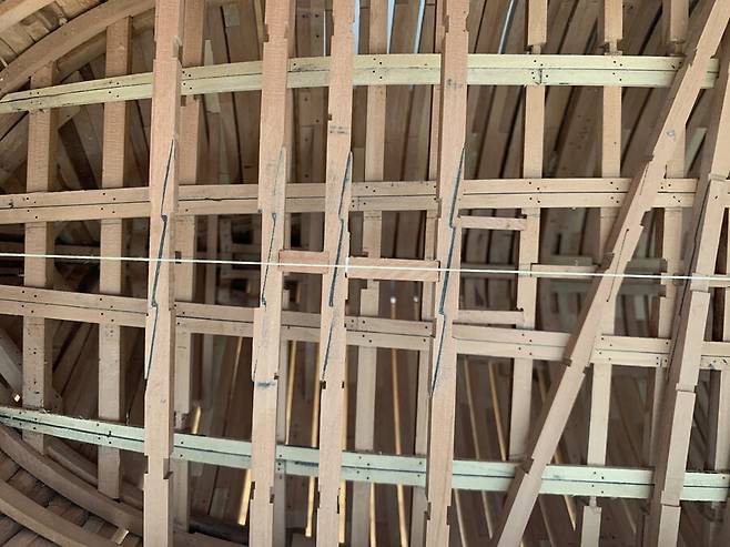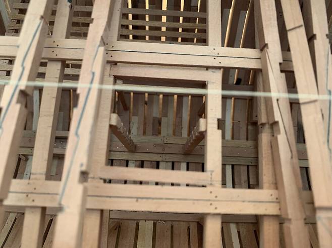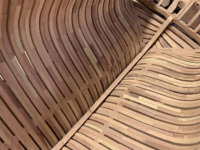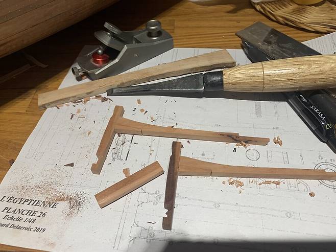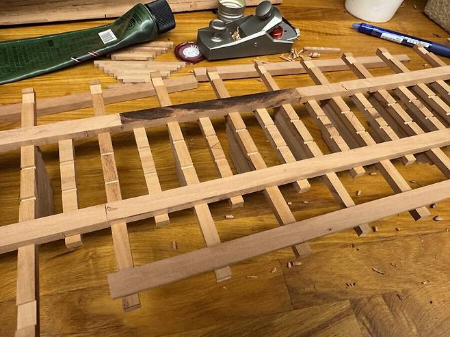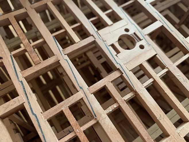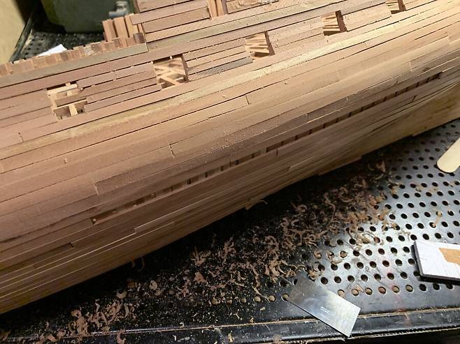 배의 용골을 제작하는 모습중 한컷 입니다. 용골도 키트로 만들때엔 그냥 나무 각재 하나뿐 이었지만, 이렇게 복잡하고 여러종류의 목재들이 적층되고 맞물려서 만들어진다는 것을 알았습니다. 저 홈 위에 늑골이 자리잡게 됩니다.