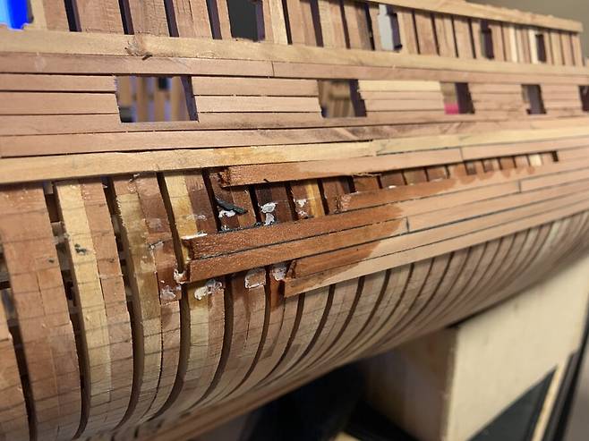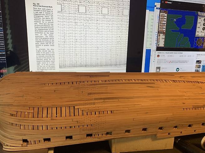 플랭킹 위에 못 작업을 진행하는 중입니다. 네일링, 스파이킹 이라고 하는데 도면에 역시 못자국이 모두 표현되어 있습니다. 못자국 위치 모두 최대한 고증을 지켜 박으려 애썼는데 여기에 또 몇달의 시간을 보냈는지 모르겠습니다. 지루한 작업을 침착맨님 대항해시대2 보면서 힐링하면서 진행했습니다.