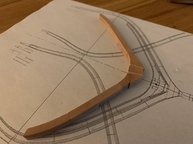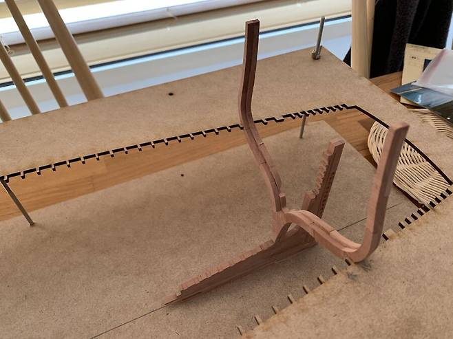 캐드로 웨일 라인을 따라 도크를 제작해서 늑골 한조를 올려본 사진 입니다. 도크는 MDF 로 레이져 커팅으로 만들었고 처음 만들어본터라 역시 많이 부족합니다. 다음에는 더 잘할 수 있을것 같습니다.
