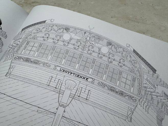 이번에는 키트를 베이스로 제작하지 않고, 실제 1700 년대의 도면을 베이스로 한 도록을 구해서 제작해보기로 했습니다. 앙크레 라는 프랑스 도록 회사의 1799 년 도면이며, 배 이름은 이집티엔, 설계자는 프랑수와 카로 입니다.