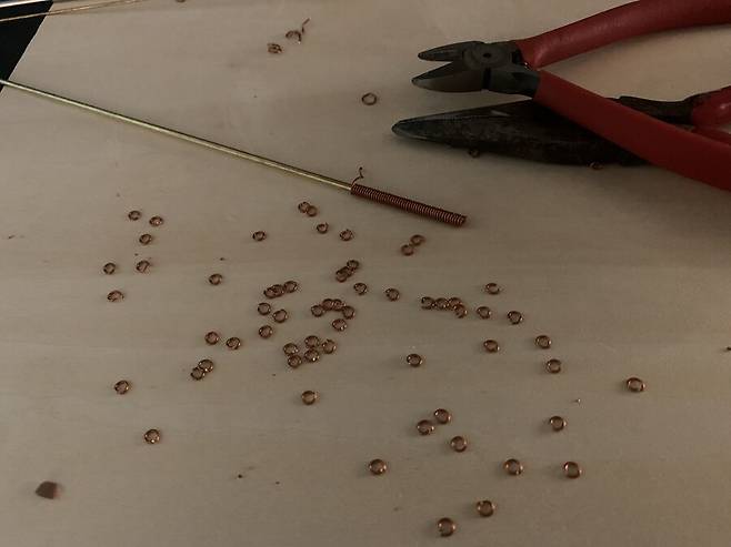 이후, 대포 의 리깅과 연결되는 갑판고정 고리도 황동선을 휘고 달구어 모양을 잡고 고정시킵니다.