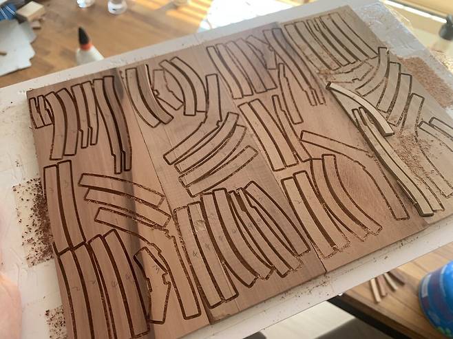 캐드로 그린 도면대로 cnc 로 목재를 재단한 후