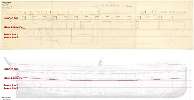 가끔 도면을 아무리 봐도 이해가 가지 않는 부분은, 실제 건조에 사용되었던 도면을 구해서 대조 하면서 확인합니다. 가끔은 수백 년 전 도면이 이해하기 더 쉬울 때가 있습니다. 위 그림은 건포트 라인을 표현하는 방식의 차이로, 수백 년 전 과 현대의 도면 표기 방식에 차이를 확인할 수 있습니다.