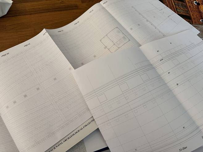 도면을 출력해 갑판 위의 부품들 위치를 확인하는 모습 입니다.
