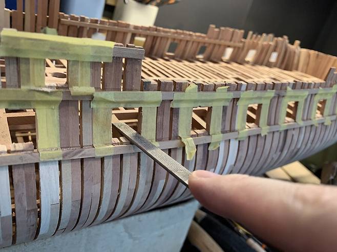 함선의 늑골 안쪽면을 갈아내는 모습 입니다. 늑골범선을 처음 만들기에 늑골이 얼마나 조립후에도 연약하고 제자리를 잡기 어려운지 미처 몰랐습니다. 사포질 중에 힘을 받게 하기위해 가이드를 장착하고 갈고 있는 모습 입니다.