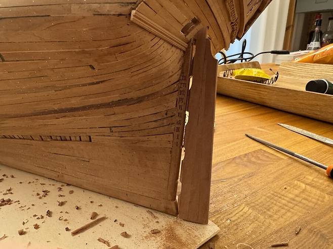 반대로 선미 입니다. 함선의 늑골, 용골의 끝부분 으로 복잡한 이음매 구조가 역시 선수와 더불어 가장 제작 난이도가 높았습니다. 역시 폐기와 재작업을 몇번 거치면서 몇번을 다시 만들게 되는 부분 입니다.